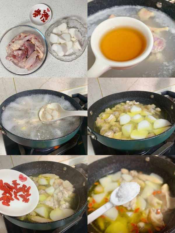 材料:鸡、白萝卜、枸杞、葱花、盐、料酒。