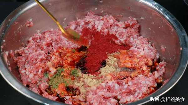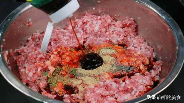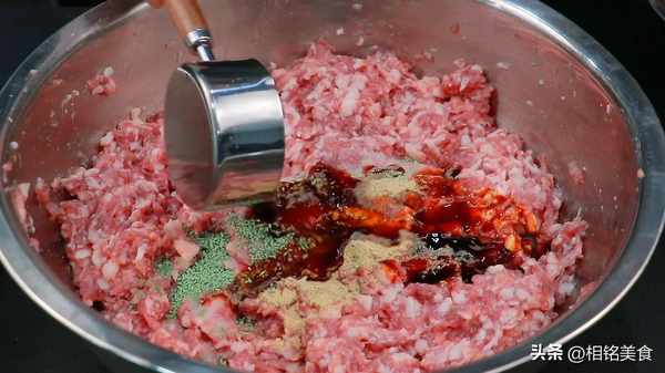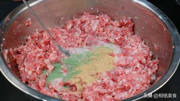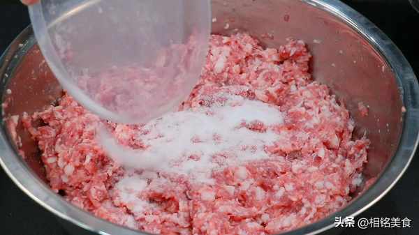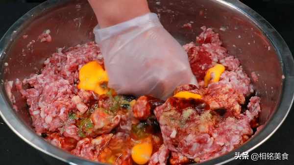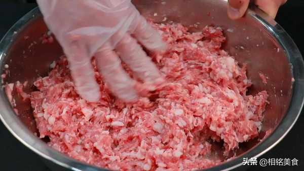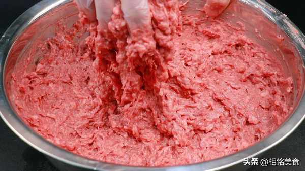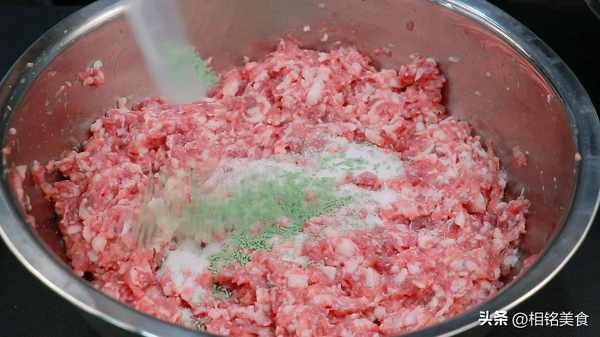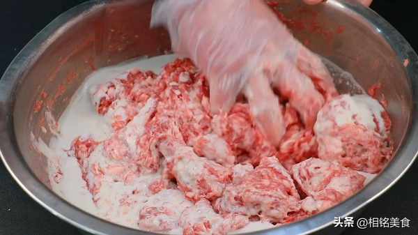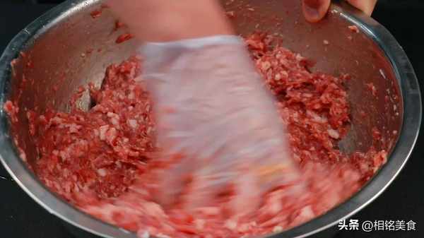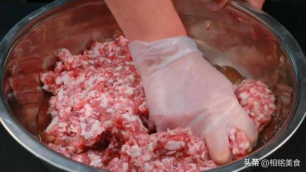 倒肉馅里面搅匀,整个过程就是顺一个方向搅拌,搅拌至有一点能力起来就可以了;