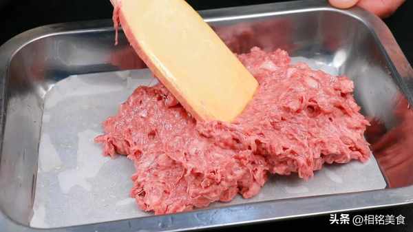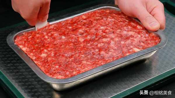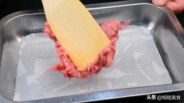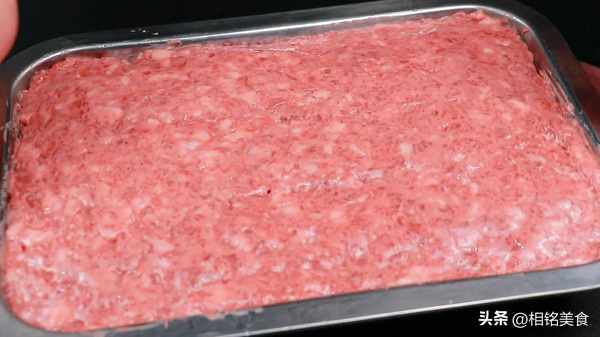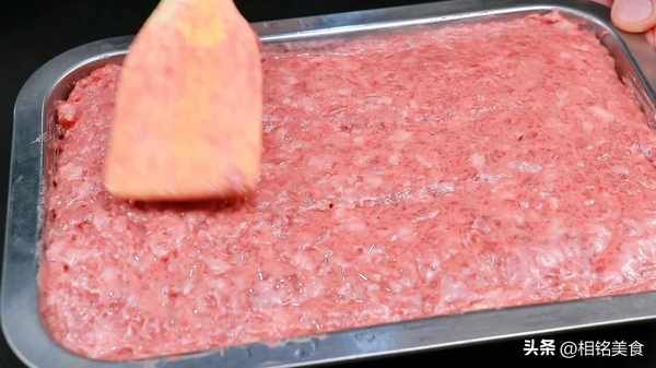 把肉放进去,铺平压实,尽量不要留空隙。这样午餐肉做出来就不会有那么多小孔;