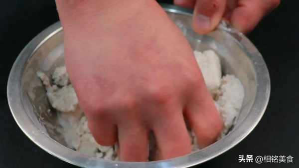 抓匀以后,继续顺一个方向搅拌上劲。搅拌的时间越久,午餐肉吃起来口感越筋道;