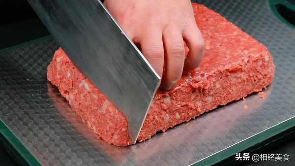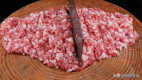 肉的水分晾干以后分割成块,再切成片,切好以后再剁一下,不需要太碎,稍微有一些颗粒感,用刀剁的比用绞肉机绞出来口感要更好一些;