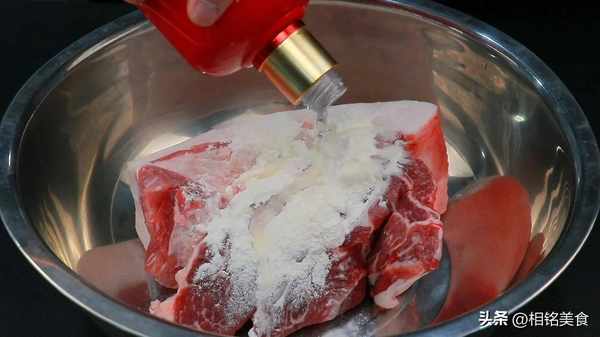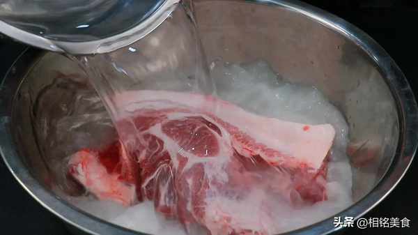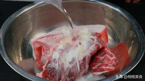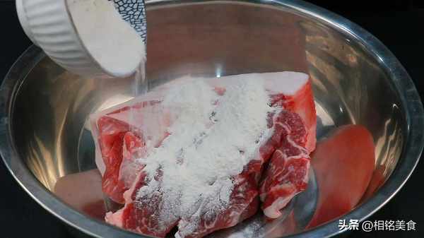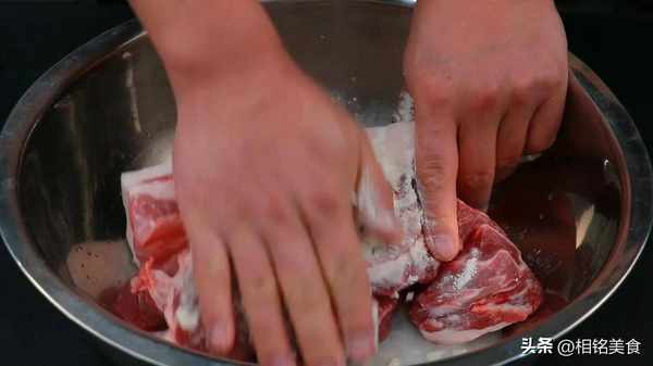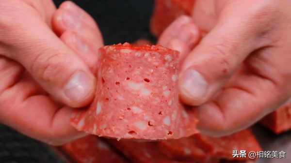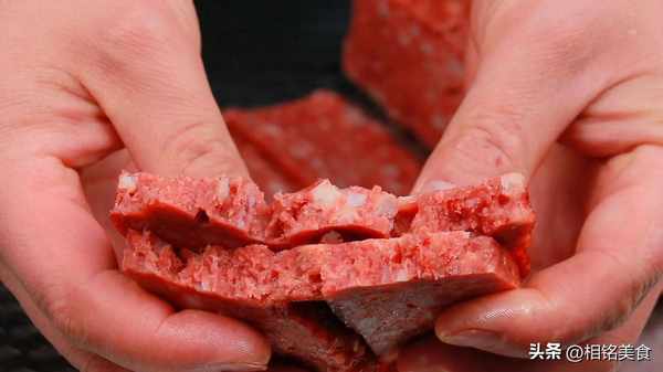 往里面加入一些面粉和高度白酒,再加一点水,搓洗一下,面粉有较强的吸附性,可以把肉洗得更干净,白酒有杀菌作用,可以延长午餐肉的保存期限;