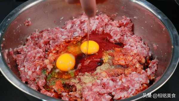 接着加入盐二十二克,鸡精十克,胡椒粉八克,生抽二十克,蚝油十五克,红曲粉二十克,打入两个鸡蛋;