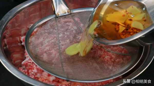 花椒水放凉以后过滤一下倒进肉馅里,先抓拌至水分吸收,再顺一个方向搅拌上劲。这个是午餐肉吃起来口感筋道的关键;