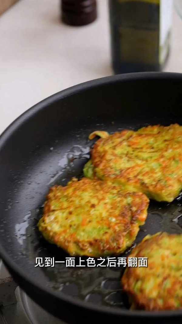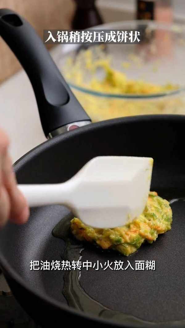 今天用橄榄油或者其他植物油都可以,把油烧热转中小火,放入面糊,可以稍微压一下,压成饼状。火力注意不要太大,煎到一面上色之后再翻面,耐心多翻几次。直到煎到表面像这样焦脆,西葫芦蛋饼就完成了。
