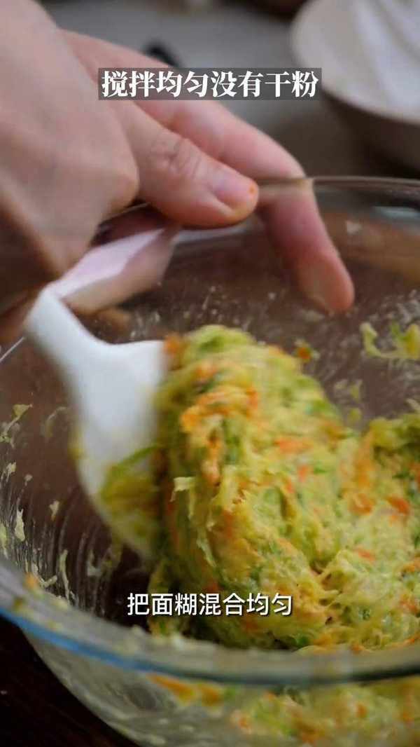西葫芦已经腌出了超级多水分,所以今天关键的一步就是要把它的水分尽量挤干,就是让它做出来口感更好的关键。我这里沥干水分的几样蔬菜加起来大概250克左右,我加了50克面粉供大家参考。除了盐,黑胡椒调味,还加了一点帕玛森芝士增香。没有的话可以不加,加入一个鸡蛋,把面糊混合均匀,没有干粉就可以准备起锅了。