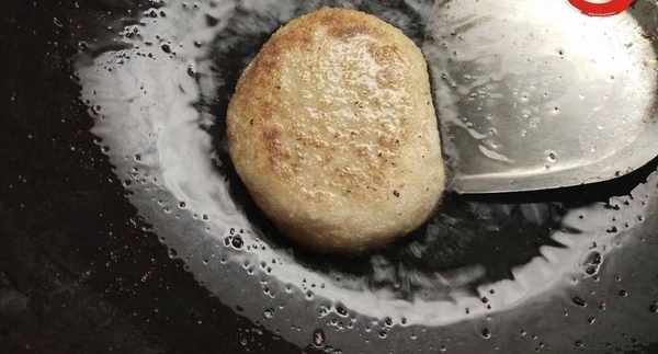步骤九,“戳裂煎煮”:煎制到糍粑的两面都是金黄的时候,将糍粑在锅铲上戳一下,使糍粑的表面裂入油脂,里面被加热。