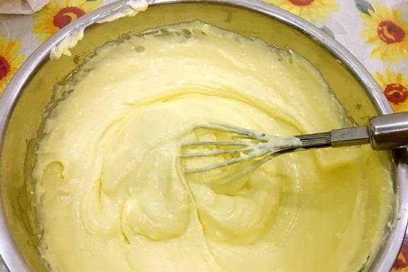3、奶油芝士和黄油都需要提前软化,此时把提前软化的奶油芝士加入热的卡仕达酱中,搅拌至顺滑状态。