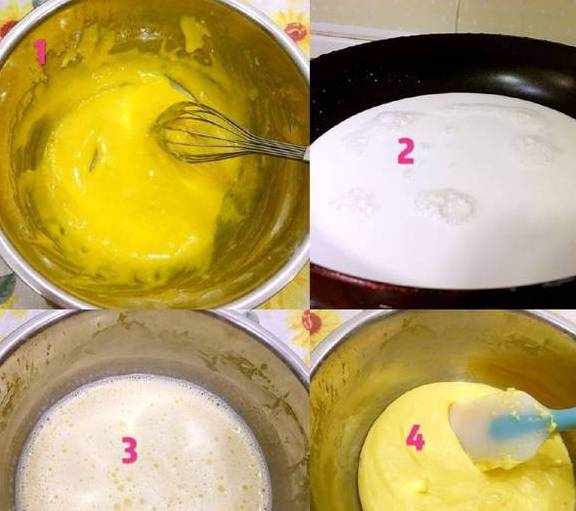 2、牛奶加热至温热后少量多次的加入步骤一的蛋黄糊中,搅拌均匀后,过筛,倒入锅中继续加热,一边加热一边不停地搅拌,直到液体完全粘稠后离火继续不停地搅拌至顺滑状态,如此,卡仕达酱就制作好了。