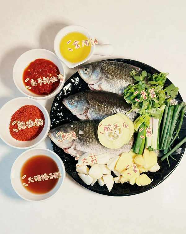 鲫鱼 葱姜蒜 酸木瓜(没有可只用梅子醋) 辣椒酱 辣椒面(粗细均可) 梅子醋(灵魂所在)香菜 食用油 食盐