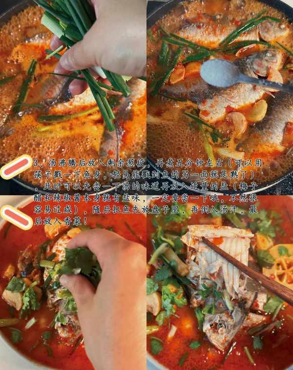 3、汤沸腾后放入剩余葱段,再煮五分钟左右(可以用筷子戳一下鱼身,轻易能戳到鱼的另一面就是熟了),此时可以先尝一下汤的味道再放入适量的盐(梅子醋和辣椒酱本身就有盐味,一定要尝一下哦,不然很容易过咸),随后把鱼先放盘子里,再倒入汤汁,最后放入香菜!