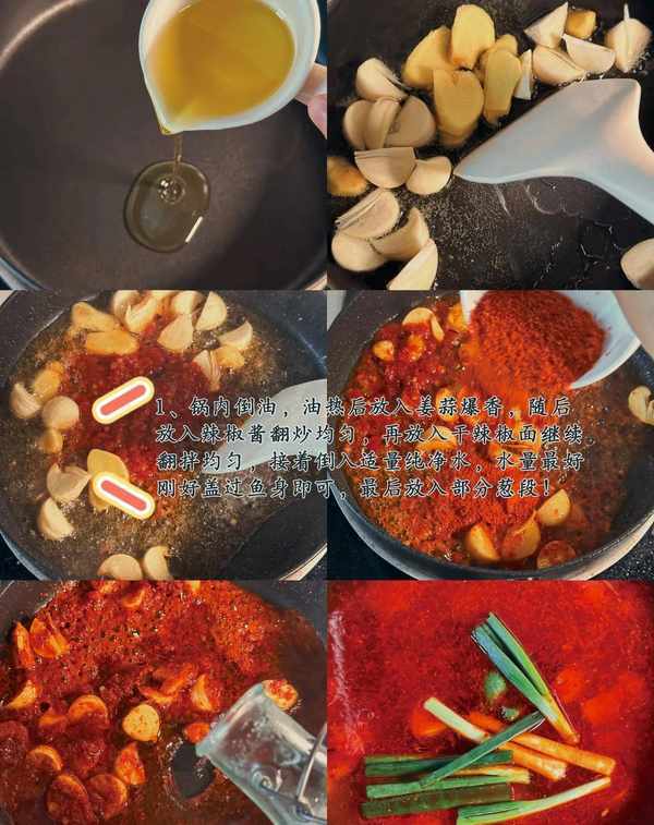 1、锅内倒油,油热后放入姜蒜爆香,随后放入辣椒酱翻炒均匀,再放入干辣椒面继续翻拌均匀,接着倒入适量纯净水,水量最好刚好盖过鱼身即可,最后放入部分葱段!