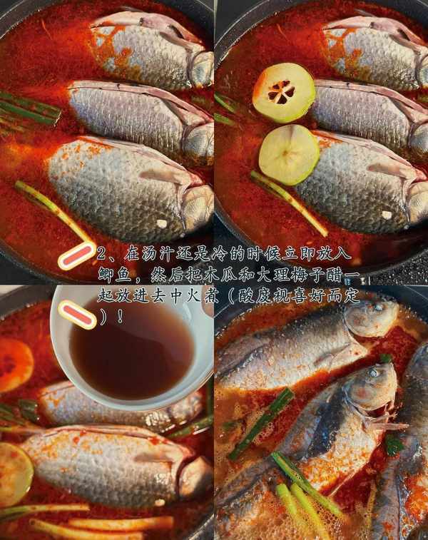 2、在汤汁还是冷的时候立即放入鲫鱼,然后把木瓜和大理梅子醋一起放进去中火煮(酸度视喜好而定)!