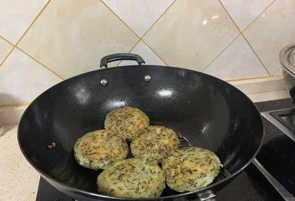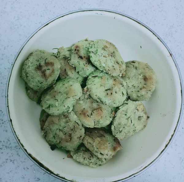 面团不用发酵,直接揉匀,放在手心做成面饼。做好的面条可以用蒸锅蒸,也可以用平底锅、油锅油炸。两面都炸得焦黄酥脆,腊肉释放出来的油浸透了面饼。咬一口,香气四溢,夹杂着淡淡的盐味,味道十足。