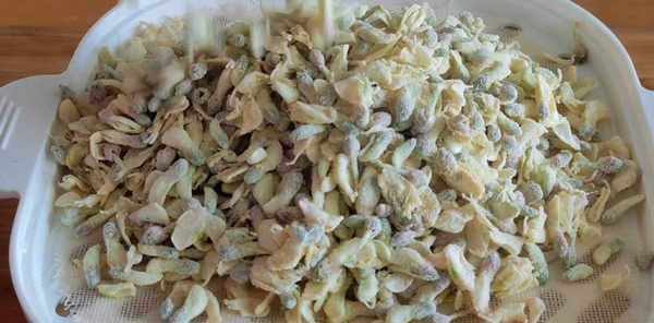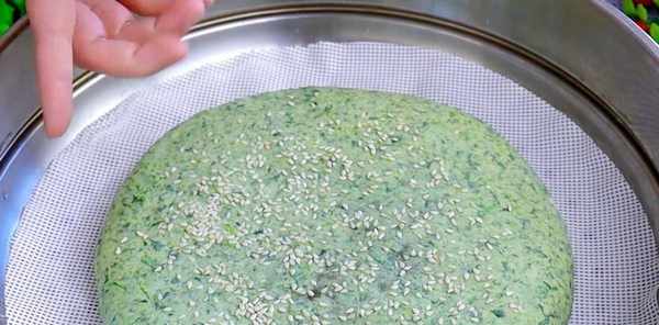 均匀的铺在筐上晾干,尽量铺的均匀,大约半个小时,槐花表面的水都干了,盛入一个大碗里。