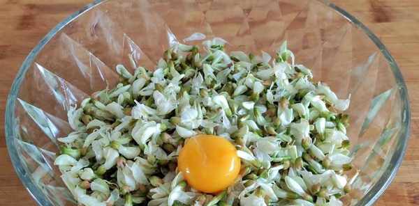 倒入少许食用油拌匀,将蛋黄打散,用筷子搅拌均匀,让每一朵槐花都沾满蛋黄。