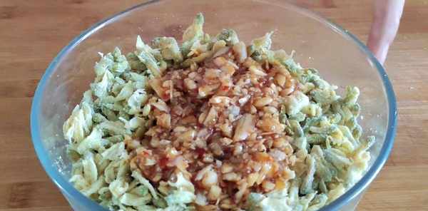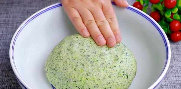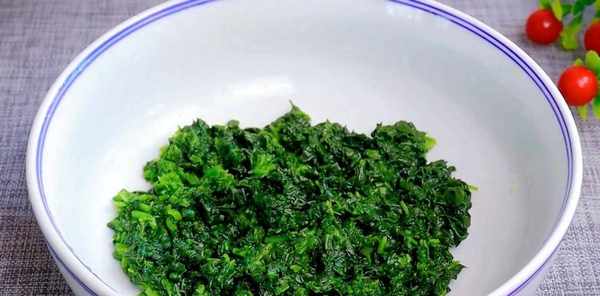 挤干水分放在砧板上,切碎放入大碗中,加入半勺小苏打拌匀。
