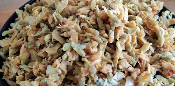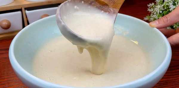 和好面团,将一勺淀粉、一勺泡打粉、一勺食盐、一勺五香粉倒入大碗中,打入一个鸡蛋,倒入适量的水,用勺子搅拌均匀,然后加入一勺淀粉面团,搅拌至酸奶浓稠。