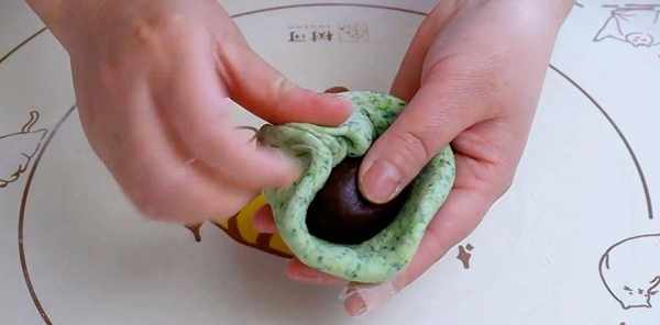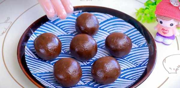 准备适量的豆沙馅放在案板上,用手揉成长条,分成小块用手揉成球。