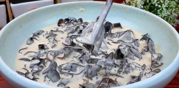 制作步骤:大碗里放一把黑蘑菇,倒入一勺面粉,一勺白糖,倒入温水,拌匀浸泡10分钟。