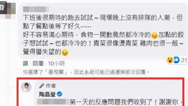 在5月开业当天,陶晶莹还在社交平台上发文宣传自己的麻辣烫店,欢迎粉丝和网友前往尝鲜。因为陶晶莹自带的明星效应,大多数消费者都跑去陶晶莹的麻辣烫店尝鲜捧场,当天没有人山人海般需要排队,但令消费者不满的是还要等待很久,而且其当中看到店里管理很不到位,店里服务也很敷衍对待顾客,好不容易等食物上了之后,却发现食物已经冷了,而且有的食物甚至还没有煮熟,消费者很不满意纷纷在陶晶莹的社交下留言投诉。