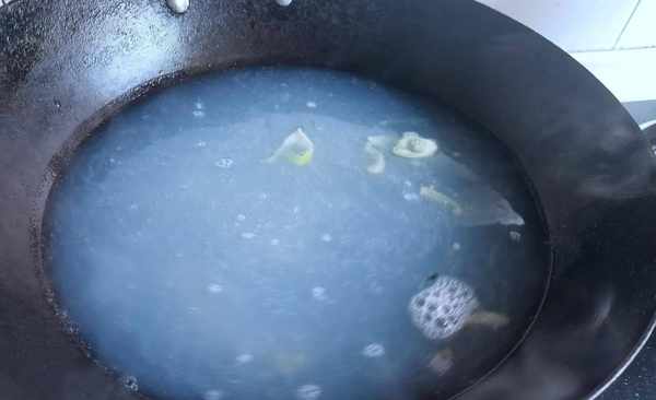第三步:锅内放花生油,加入葱花、姜末炒香,倒入海虹汤。