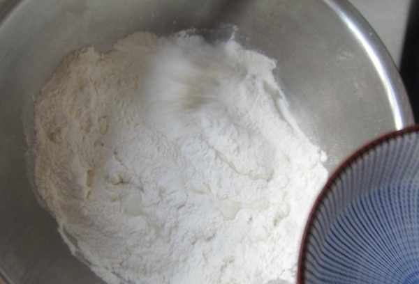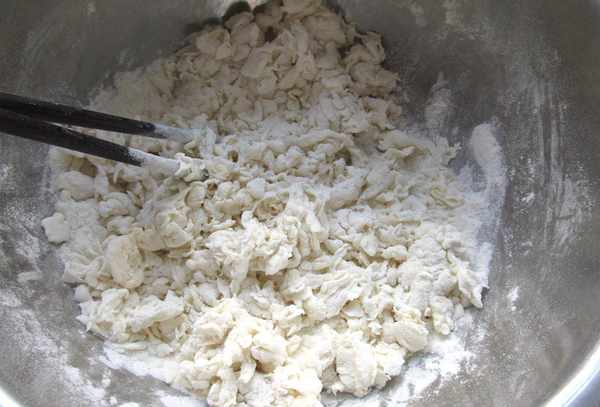 第5步:将面疙瘩与面粉混合。这很简单。将面粉放入盆中,撒上少许盐水。