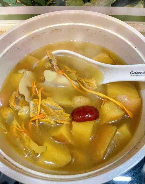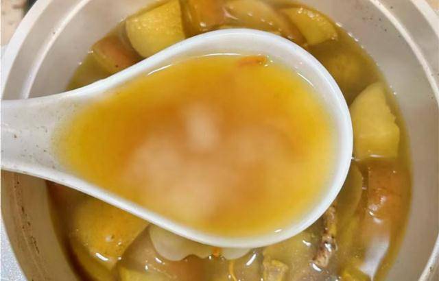 第七步:转小火炖煮30分钟,加上一丢丢食盐和白胡椒粉,用勺子迅速搅动一会儿,煮大概12分钟左右,关火出锅,这款苹果无花果猪展汤就制作完成了。