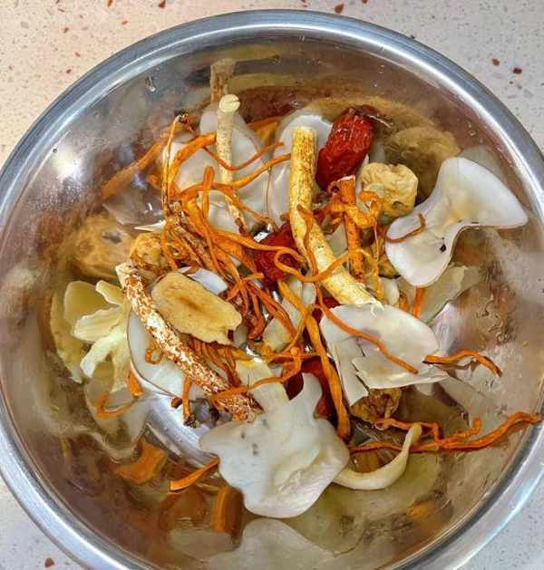 第三步:无花果用温水泡发开,干百合用温水泡一会儿,撕掉一层白透明的薄膜,虫草花也温水泡好,将玉竹,海底椰和五指桃洗净,控干水分。
