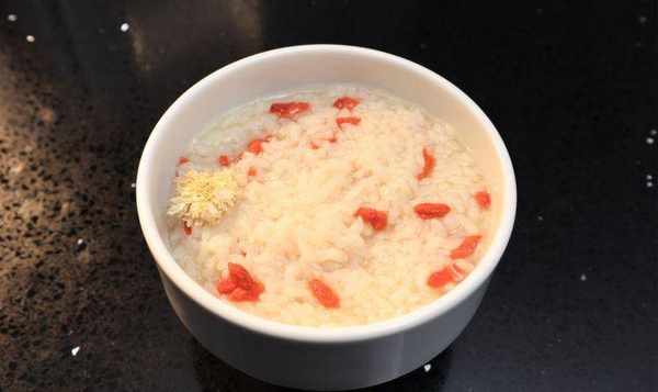 2.在药汁中加大米煮粥,待熟时加入枸杞,调入白糖,再沸即成。