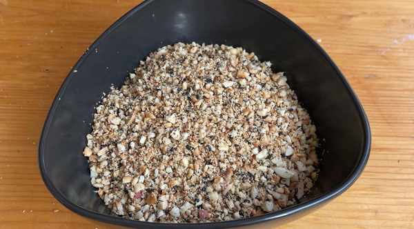 准备一碗花生米,放入炒锅中炒熟。当声音停止时,花生米差不多熟了。把它们拿出来让它们冷却。将黑白芝麻放入半个碗中,炒熟。白芝麻稍微变黄。没关系,这里要注意低温慢炸。炸好后,需要散去热量,然后放入碗中。花生冷却后,去掉花生皮。将洗净的花生米和黑白芝麻倒入保鲜袋中,用擀面杖擀碎,倒入碗中。