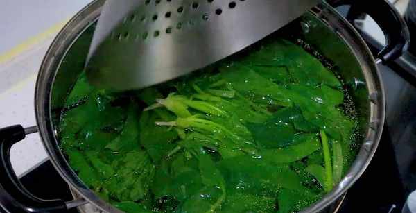 1.准备菠菜,去黄叶,用清水浸泡,根部洗净,不要扔掉,切段备用。锅中加水烧开,加入盐和油,下入菠菜焯水去草酸,煮沸捞出,放入冷水中冷却后捞出待用。