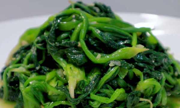 2、热锅冷油,放入蒜末炒香,加入菠菜、调味盐、糖、鸡精炒香,锅中加入香油。