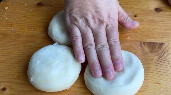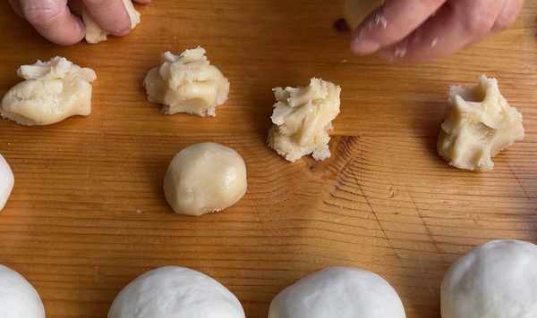 桂花糖,搅拌至湿润即可。面团看起来很软。取出白色面团并关闭煤气。然后将其混合成条状。糕点面团也揉成条状。分成8份。首先,油酥也分成等份,每份擀成球备用,面团压扁,直接包油酥,合上嘴,每份包好。