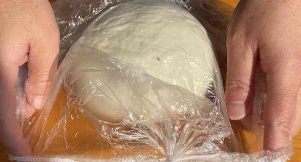 和面,准备300克普通面粉在一个大碗里,这个量可以做8个大饼,加入3克酵母,170克30度左右的温水和面,水少加和匀面粉加10克食用油揉成大片状,然后揉成面团,完全揉成球状,然后移到砧板上像搓衣服一样搅拌均匀,揉成光滑柔软的面团,包上保鲜膜并放在一边。