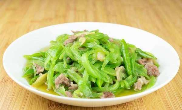 3、锅中倒油,放入瘦肉翻炒至变色,再倒入莴笋炒软,加入青椒和少许的盐,翻炒几下就可以出锅了。