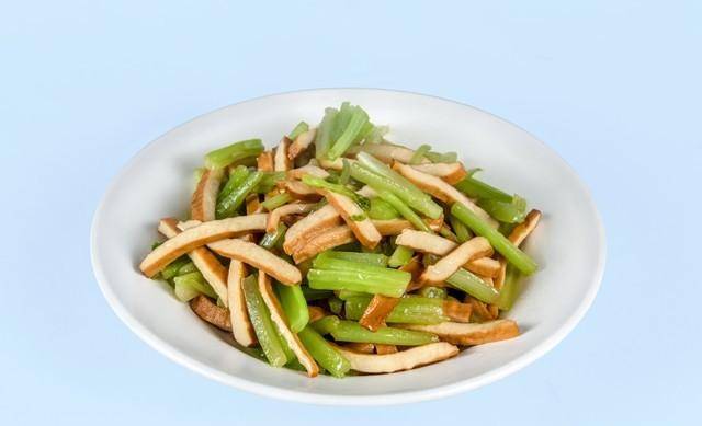 3、锅中倒油,放入香干,加盐和酱油炒一下,再放入芹菜,炒熟后就可以出锅了。