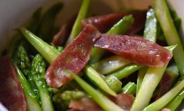 原料:广式香肠、芦笋,酱油、盐、花生油。
