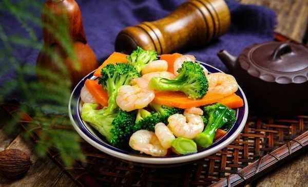 原料:西兰花、虾仁、胡萝卜、盐、料酒、酱油、盐、花生油