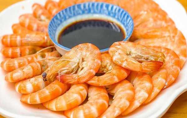 3.准备一个小碗,放入适量的蒸鱼豉油、生抽、香醋、鱼露,搅拌均匀就可以了。把冷却后的鲜虾取出来,整齐地码放在盘中。