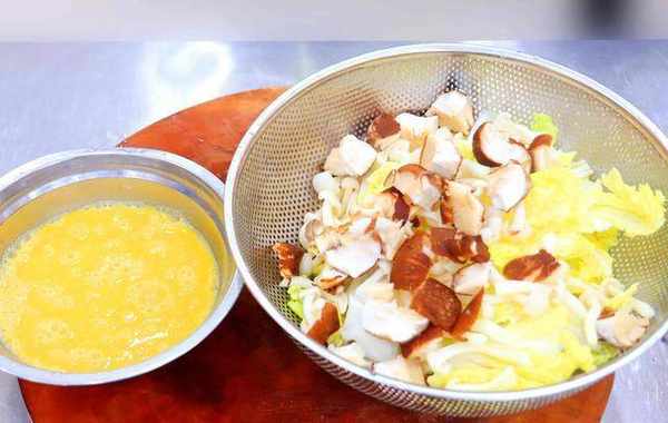 1.准备一个小盆,抓入一把枸杞子用清水泡上。娃娃菜去根以后,撕成一片一片的,香菇用手掰成小块倒入清水清洗。准备一个小盆,打入三个鸡蛋,加入食盐2克,用筷子快速搅散。