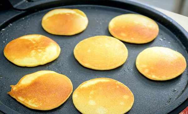取出电饼铛通电加热,锅热以后,不用刷油,舀一勺子鸡蛋糊倒在锅内。倒成一个圆饼的形状。多舀几勺子,锅内一次能做5到6个。
