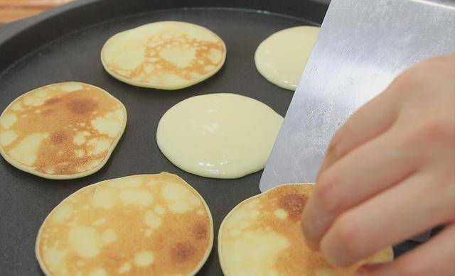 小饼子成型以后,用锅铲把小饼翻过来煎另一面,两面都煎至金黄。