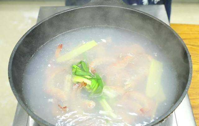 2.锅内烧水,放入一个小葱结,几片生姜,淋入适量的料酒去腥增香,等葱姜水充分熬香、沸腾以后再下大虾,这样大虾在沸水中能够快速成熟,保留鲜香味。