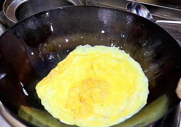 2.把鸡蛋煎一下。锅内烧油,热锅凉油煎鸡蛋不会粘锅,鸡蛋倒入锅内,快速晃动锅,把鸡蛋一面煎至金黄。翻一下锅,煎另一面,鸡蛋两面都煎至金黄。