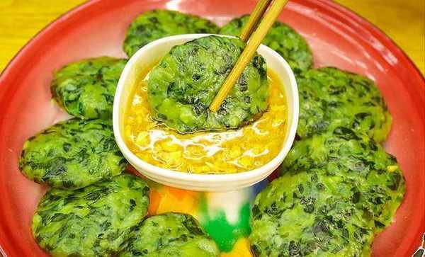 捣碎以后放入碗中,加入适量的生抽、陈醋、香油,倒入一点凉白开,把料汁调拌开,一道清香鲜美的菠菜饼就做好了。