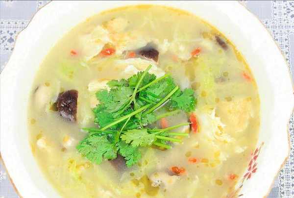 汤汁煮至粘稠时,倒入泡过水的枸杞子,再煮一分钟左右,就可以起锅倒在盆中。最后倒入一点芝麻香油,撒上几根香菜就可以食用了。