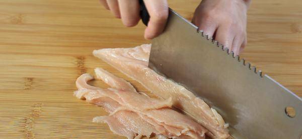 8、冷冻成型的鸡胸肉,比较容易切成方方正正的厚块;