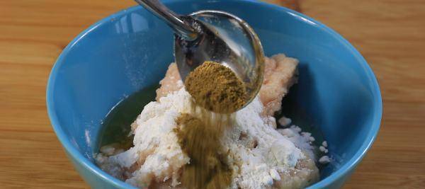 9、下锅油炸前,依次给切好的鸡块裹上一层玉米淀粉,这样做的好处是,在油炸的过程中能够锁住水分;