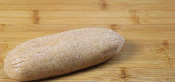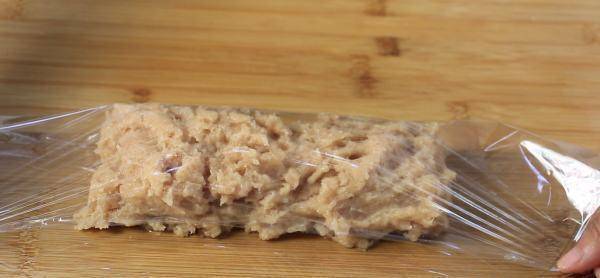 6、搅拌好之后,给肉泥定型,用保鲜膜将肉泥包裹起来,来个微整形,调整至方正的状态;
